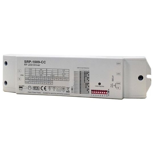 Funk Empfänger 1 Kanal für monochrome LED Quellen mit Konstantstrom bis 50W, Primär: 220-240V - 50/60Hz, Sekundär: 4-50W, 15-48VDC, Ausgangstrom 250-1500mA mit Dipswitch einstellbar, programmierbar, Eingang Push Dim, Gehäuse aus Kunststoff, IP20, Kompatibel mit Sender: SR-2833S, SR-2833K5, SR-2819SDIM LxBxH: 210 x 50 x 32mm