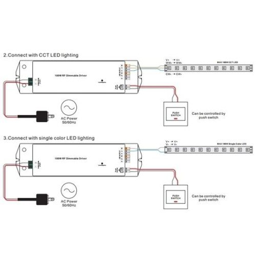 Funk Empfänger mit 2 Kanälen für monochrone oder Tunable White LED Quellen mit Konstantspannung 24VDC bis 50W, programmierbar, Eingang Pushdim, Kompatibel mit Sender: SR-2833S, SR-2833K5, SR-2819SDIM, SR-2819SCCT LxBxH: 210x50x32mm